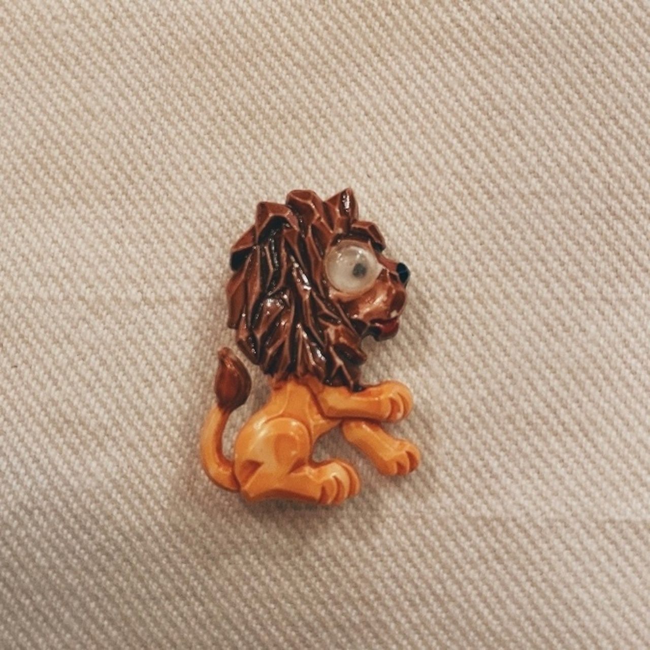 イギリスで出会ったデッドストックのライオンのブローチです。 お目目がきょろきょろ動いてファニーでとてもかわいいです。 size 約4×2.8㎝ オールドプラスチック