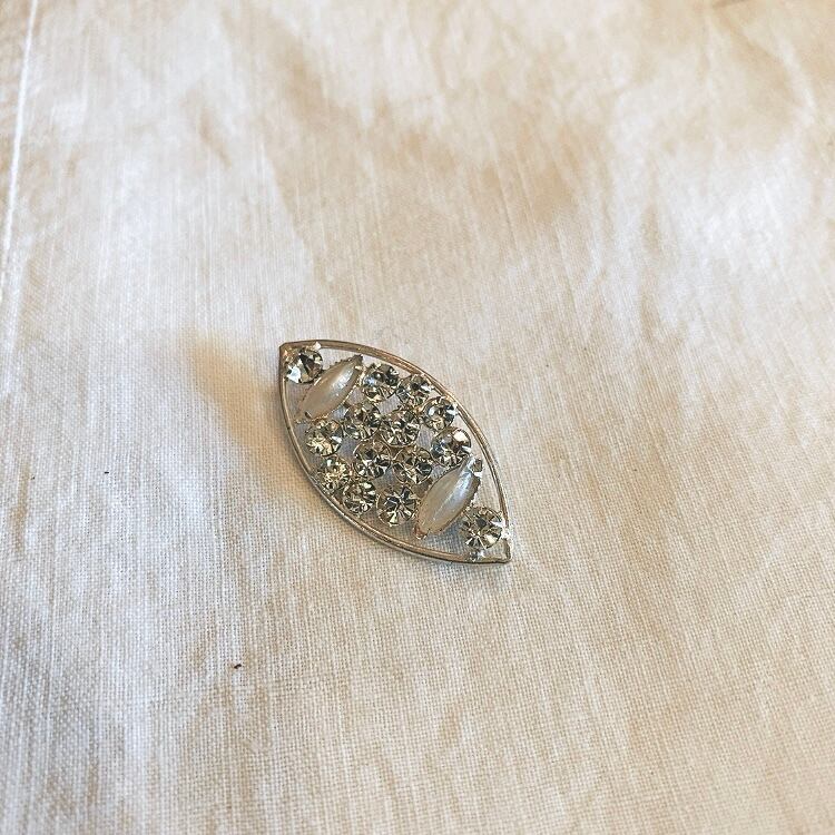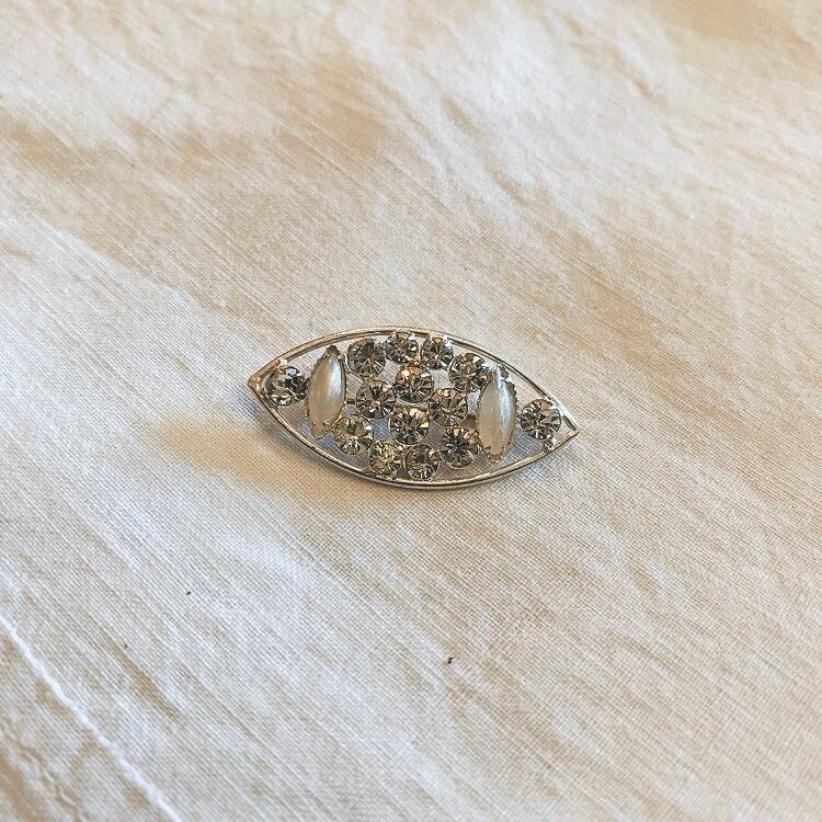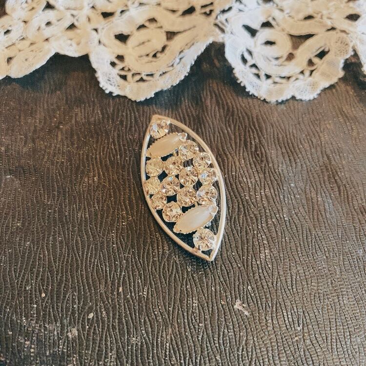 チェコのからやってきたデッドストックのオールドプラスチックとラインストーンのブローチです。 オールドプラスチックには薄くパール色の加工をしてあります。 とても軽くて使いやすいです。 どんなお洋服にも合わせやすく、襟元を上品に彩ってくれます。 約2g 約1.7×3.8㎝