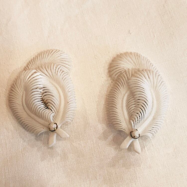 イギリスで出会った デッドストックの羽根のイヤリングです。 おおきめですが、シリコン製でとても軽いです。 耳に羽が生えたみたいにとってもキュートに楽しく身につけていただけます。 片耳の重さ:約3g 片耳の大きさ:約6×4㎝