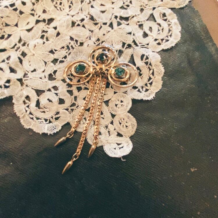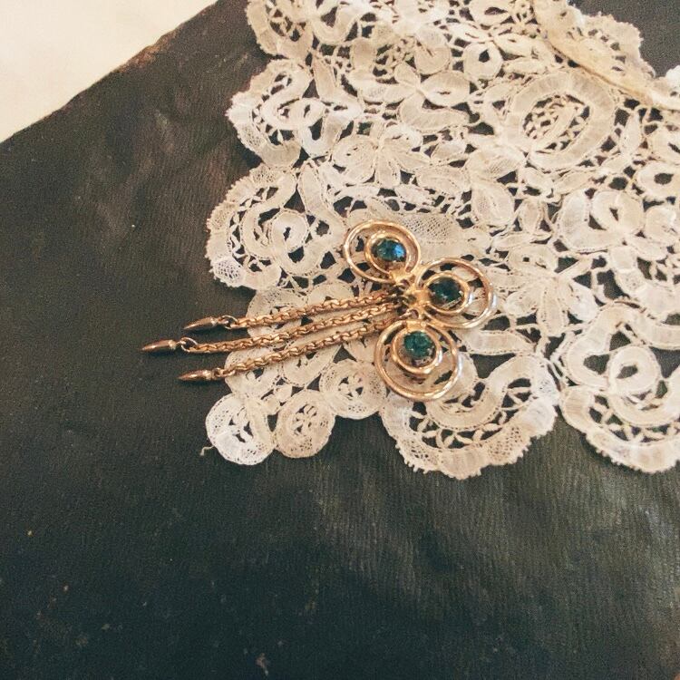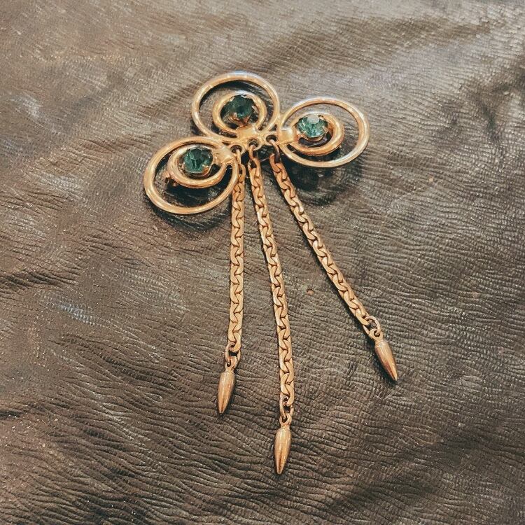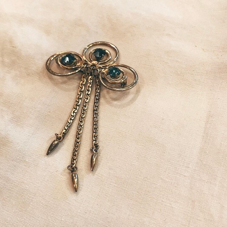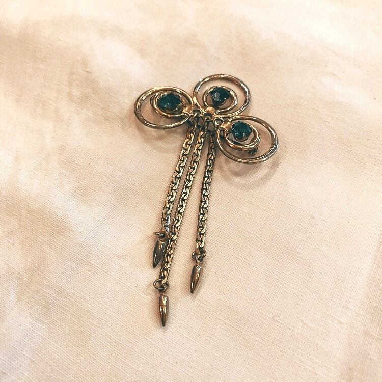 ドイツからやってきたチェーンがゆらゆら揺れるデッドストックのかわいいブローチです。 深い青いガラスみっつをぐるりと囲むのはゴールドメタルのぐるぐるたち。 その下の3本のチェーンが動くたびにサラサラと動いてとても美しく魅力的です。 渋めのゴールド色なので派手になりすぎず、使いやすいブローチです。 約10g 約9×5㎝
