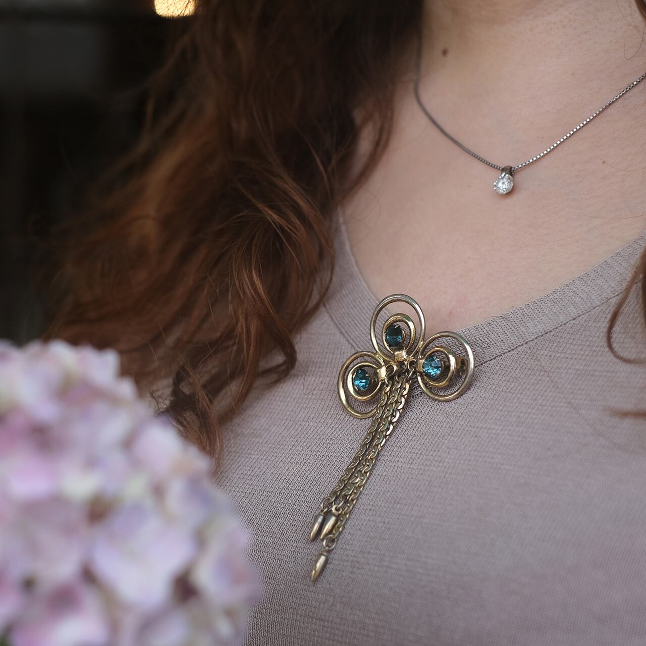 デッドストック チェーンがゆらゆら揺れるブルーガラスのブローチ