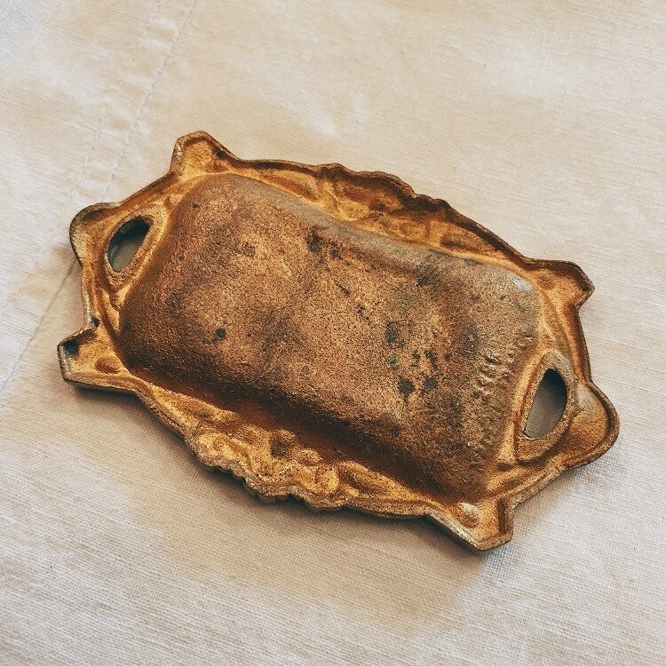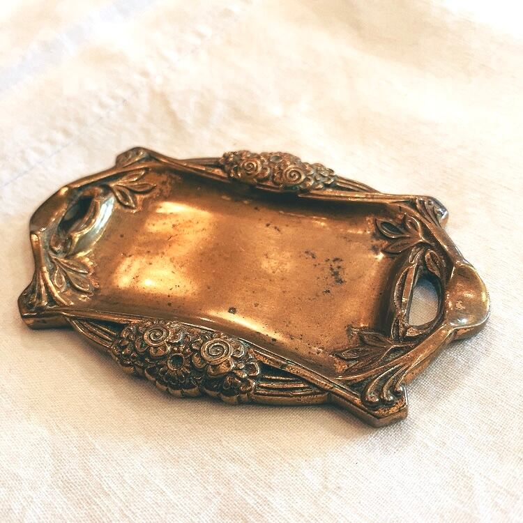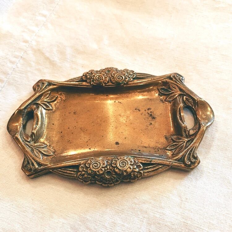 ベルリンで出会った真鍮製のトレイです。 お花や葉っぱのモチーフが可愛らしく、美しい一品です。 小さいのですが存在感はたっぷり。 普段使うピアスやリングなど、キーなどを置くトレイとしても重宝しそうです。 約6.3×10㎝