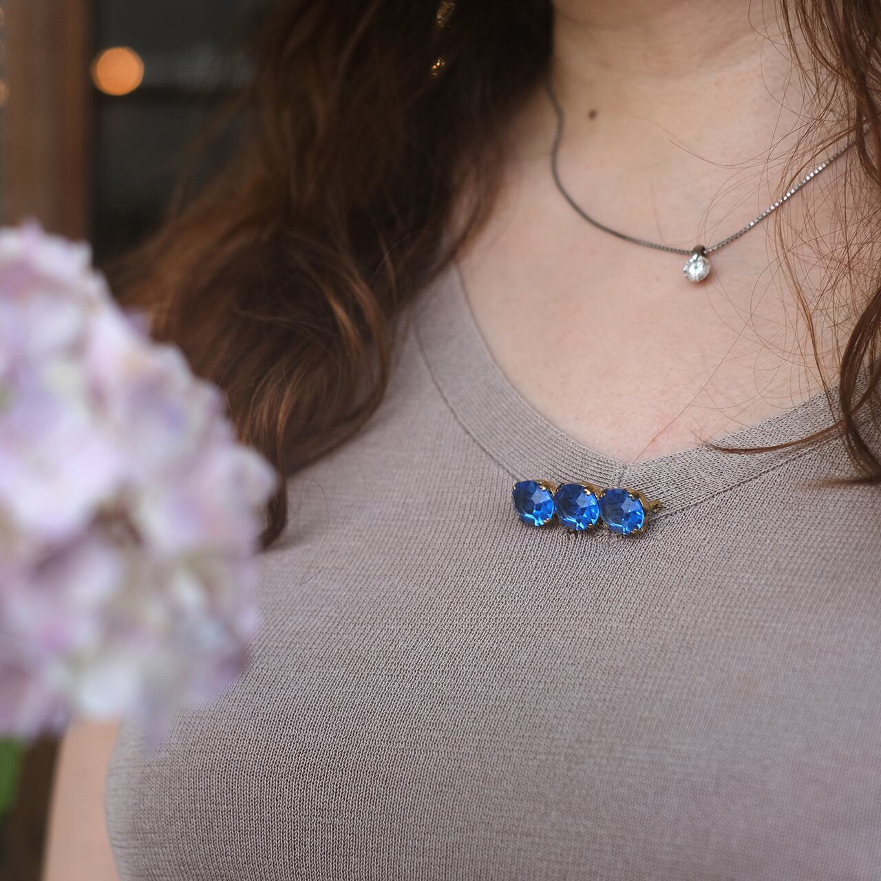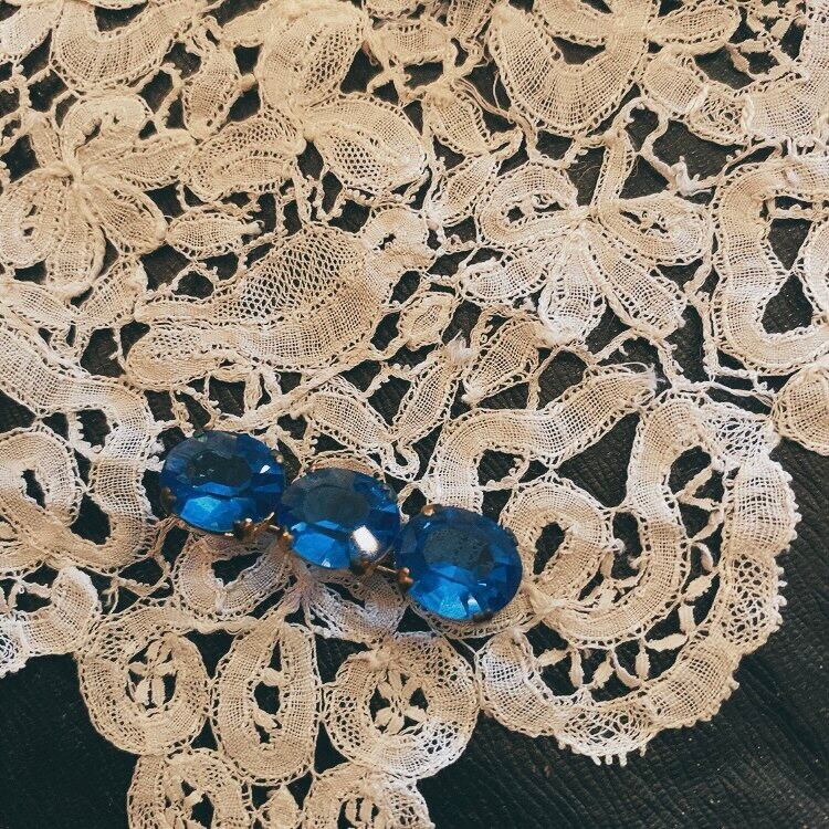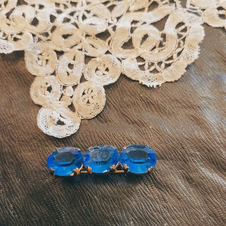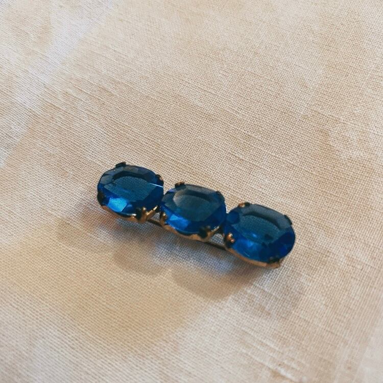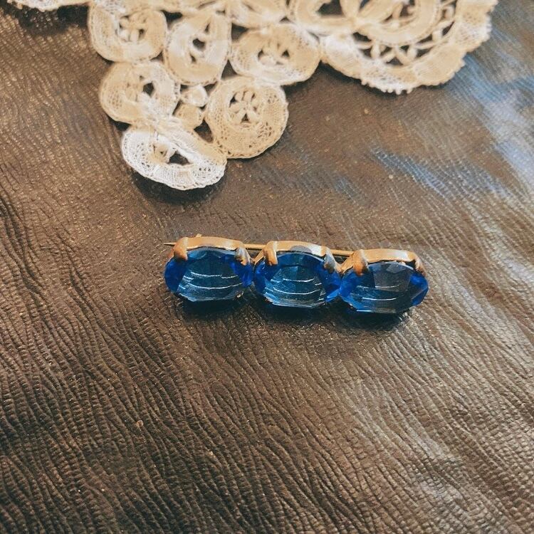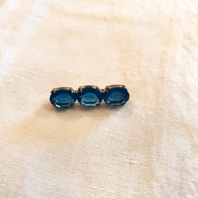 チェコで出会ったデッドストックの青いガラスのブローチです。 大きめのブルーのチェコガラス3つが横並びになった かわいいブローチ。 オープンセッティングになっているので身につけるお洋服の色やお天気によって、深い青にも鮮やかな青にも映る不思議なブローチです。 室内で撮影しているため、すこし薄めの色合いに映っています。 写真によって様々な色合いになっています。 軽く、とてもつけやすいブローチです。 約4g 約0.9×3.6㎝