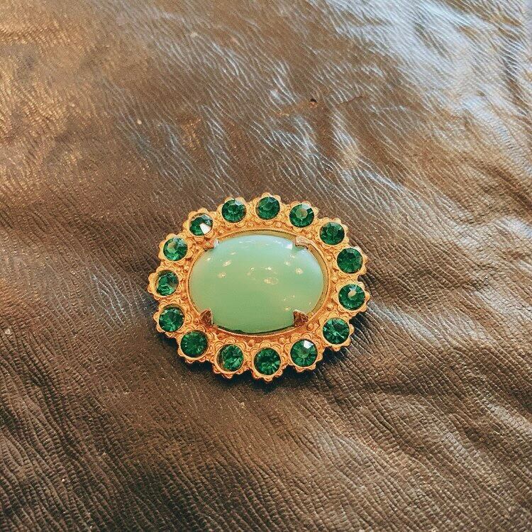 チェコで出会った緑のオーバルブローチです。 真ん中のカボションはオールドプラスチック 周りのキラキラしたグリーンはガラス。 ゴールドメタルに綺麗に配置されています。 とても軽く、普段使いに大活躍してくれそうなブローチです。 約9g 約3.5×4㎝