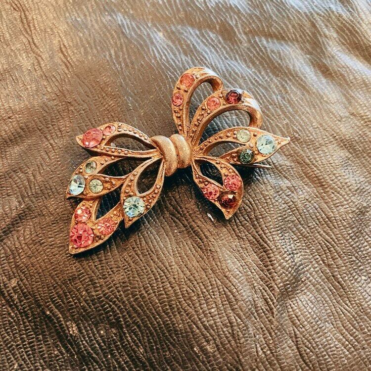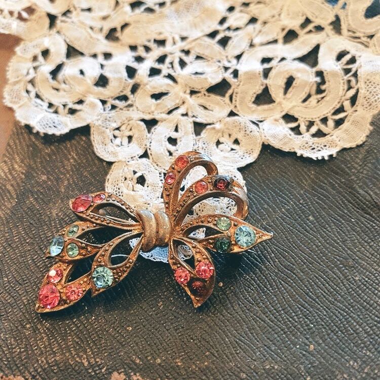 イギリスで出会ったリボンモチーフのブローチです。 シックなメタルの上にブルーどピンクのガラスが埋め込まれているかわいいデザインです。 透かしになっているので、様々な色合いのお洋服に合わせていただけます。 いくつかのガラスは後から付け替えられたようで少し色合いが違いますが、それも趣があって魅力的です。 約9g 約3.2×5㎝