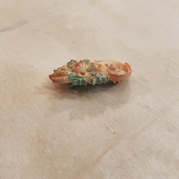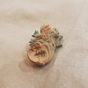 イギリスの蚤の市で出会った薔薇やいろんなお花が束ねられたブーケのブローチです。 ラッパのような形の花瓶にかわいくお花が生けられていててとてもかわいいです。 オールドプラスチックの上に彩色されています。 実際は写真よりも少し白味がかった色合いです。 とても軽くかわいく、使いやすいブローチです。 約6g 約3.8×3.1㎝
