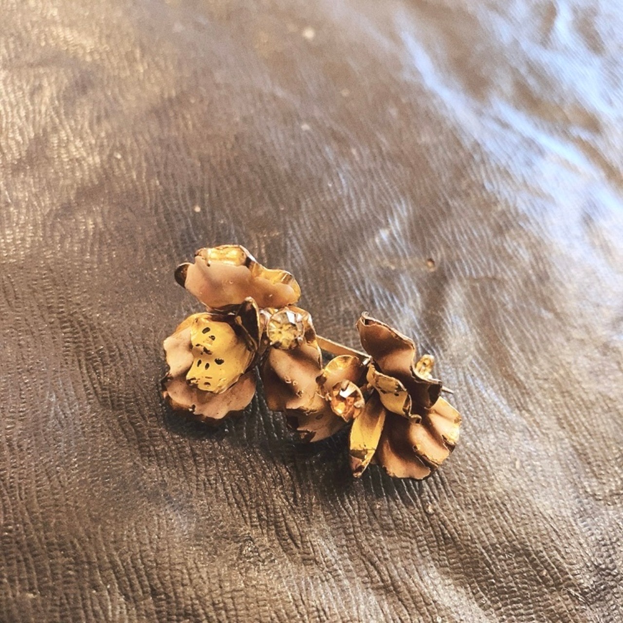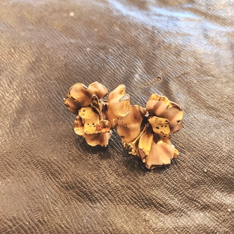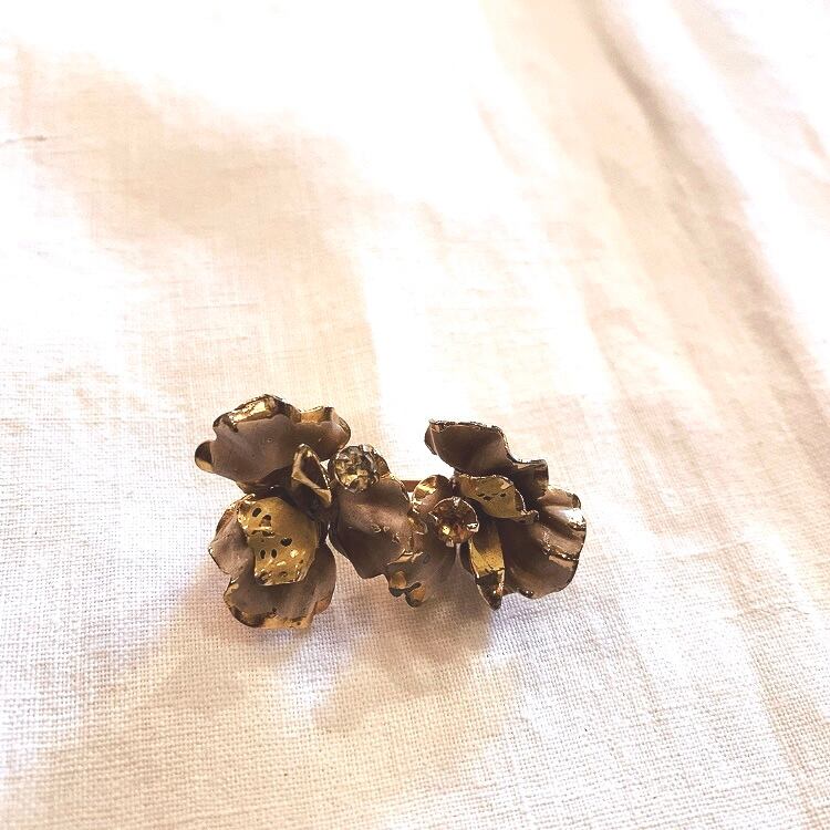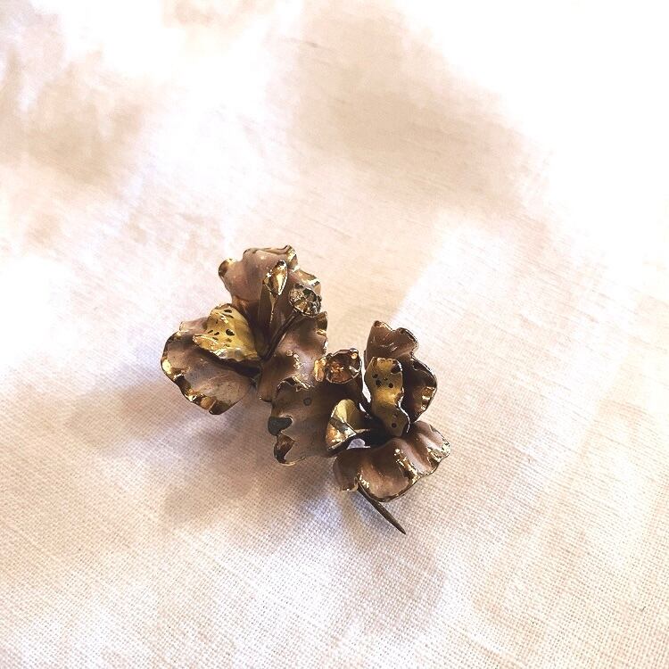 イギリスの蚤の市で出会った2つのお花が連なったブローチです。 ゴールドメタルに白ピンク紫ベージュが混ざった色合いのペイント。お花の真ん中にひとつにはオレンジのガラス、もうひとつにはクリアカラーのガラスが爪留めされています。 シックで優しい雰囲気のブローチです。 ペイント部分は経年によりかすれや剥げがありますが、それもいい味わいになっています。 軽くてかわいくてつけやすいブローチです。 約7g 約2.3×4㎝ お花の高さ:約1.5㎝