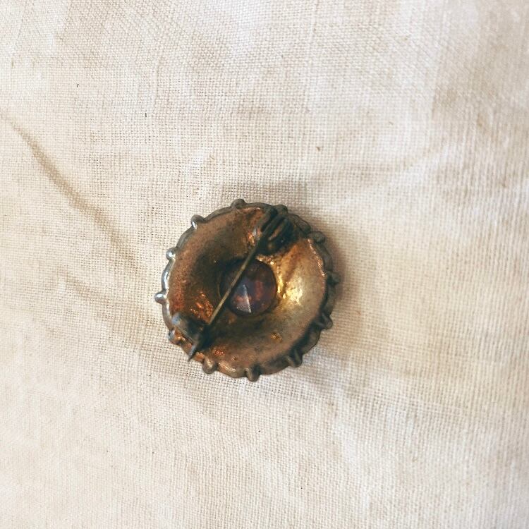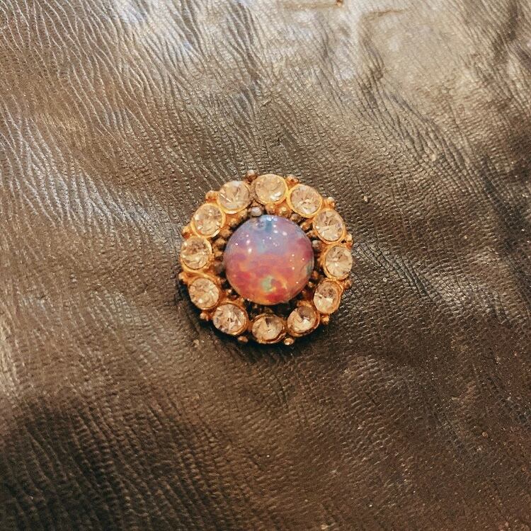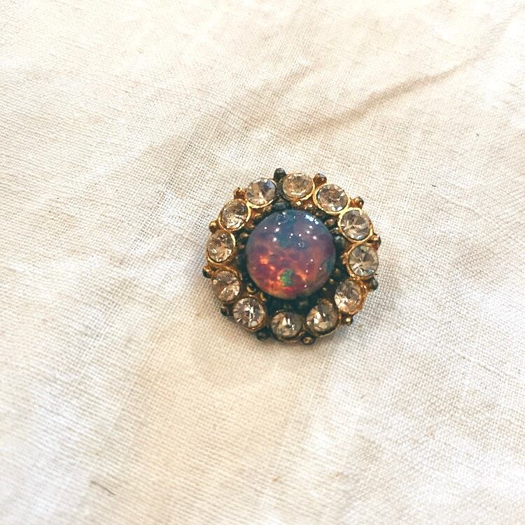 イギリスからやってきたフォイルガラスのブローチです。 真ん中のピンクのガラスの中に箔がはいっていて、不思議な光を放ちます。 周りはラインストーンに囲まれていて可愛いい印象です。 小さくて使いやすいブローチです。 ガラス、合金 約9g 直径:約2.3㎝