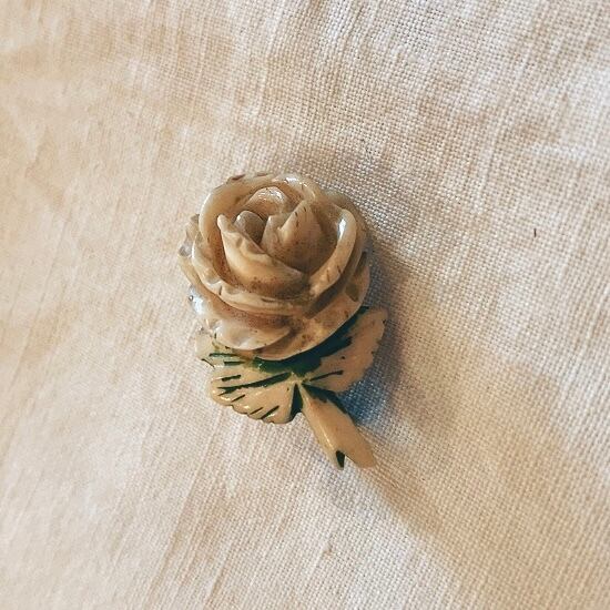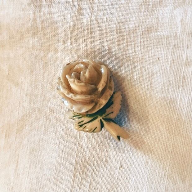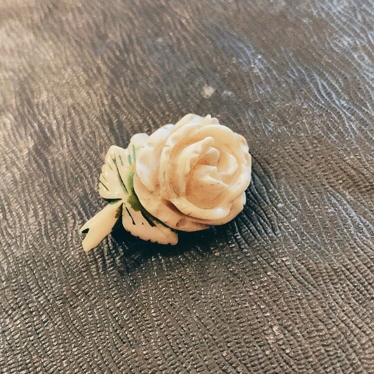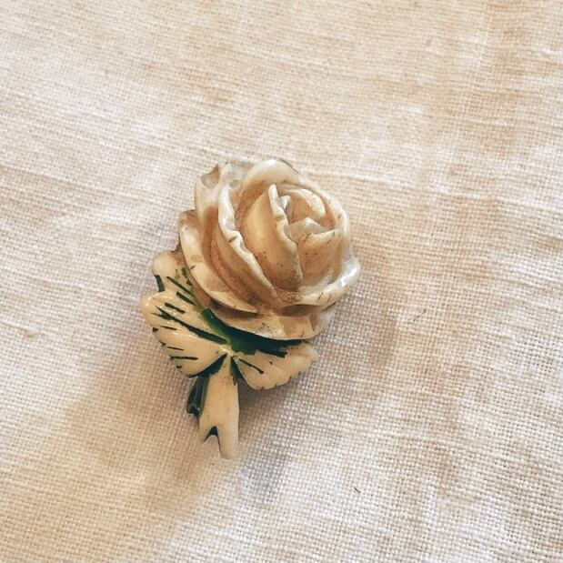 イギリスのフェアで出会った白い薔薇のブローチです。