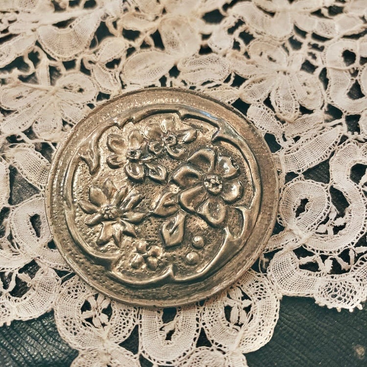 シルバーメタルにポコポコしたエンボス加工でお花がデザインされています。