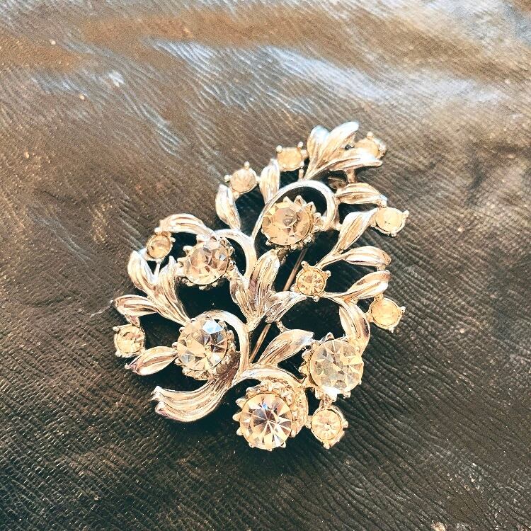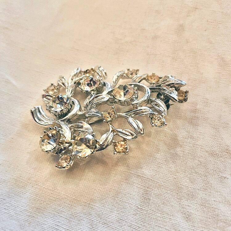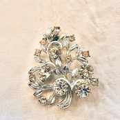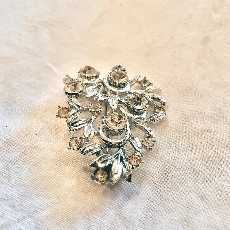 シルバーメタル ラインストーンと葉っぱのブローチ(b52)