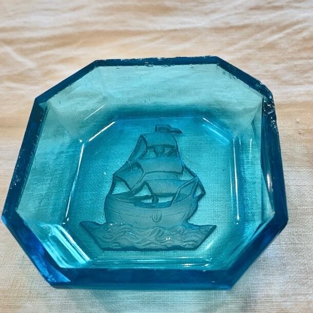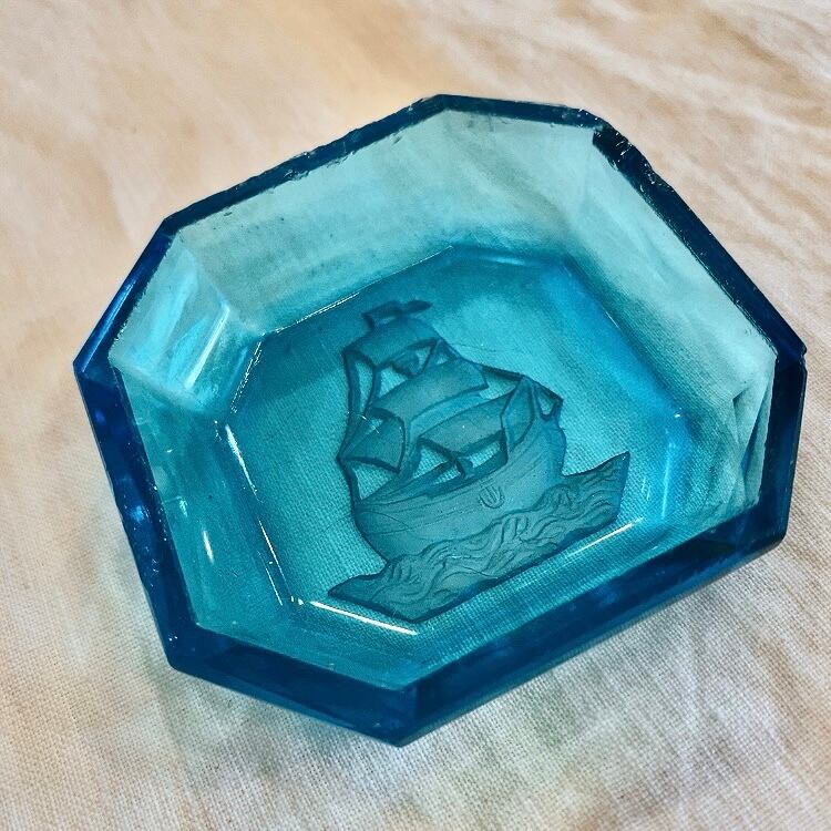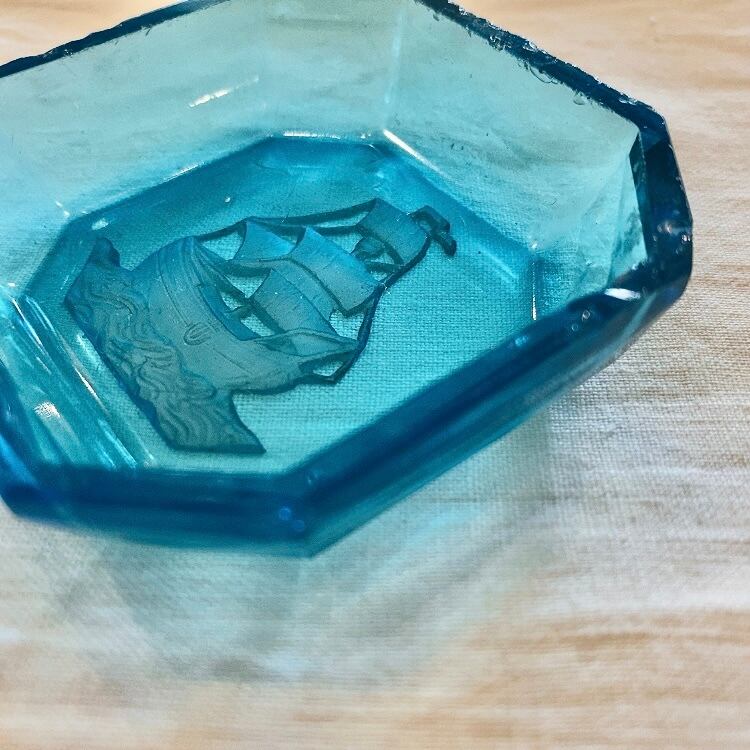 アンティークブルーチェコガラス 小さな帆船のお皿(g1)