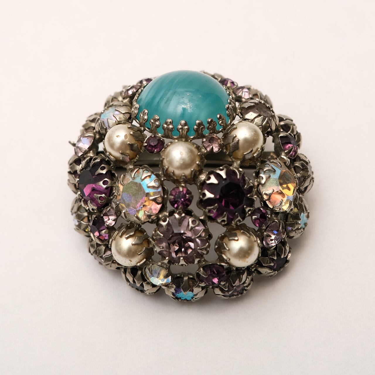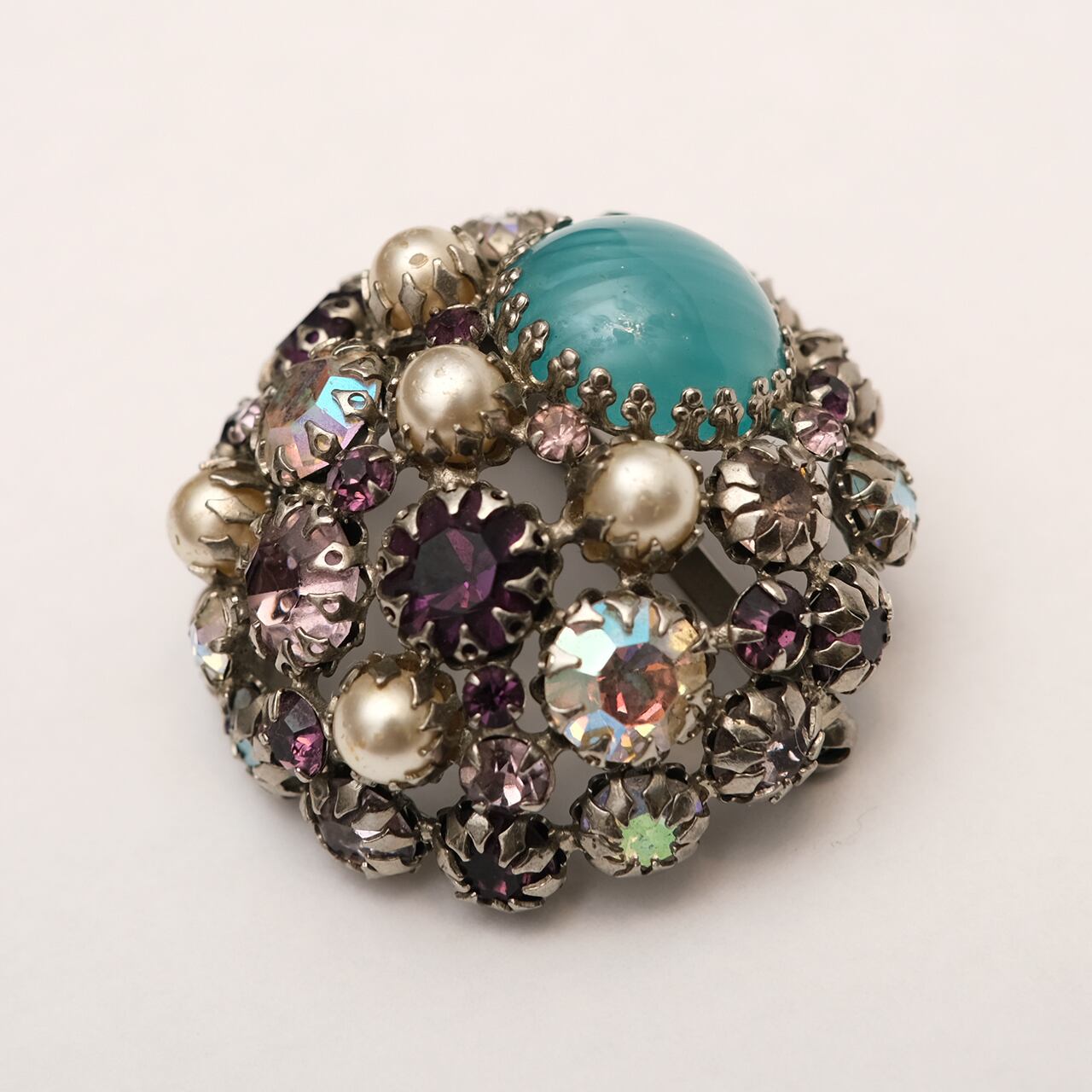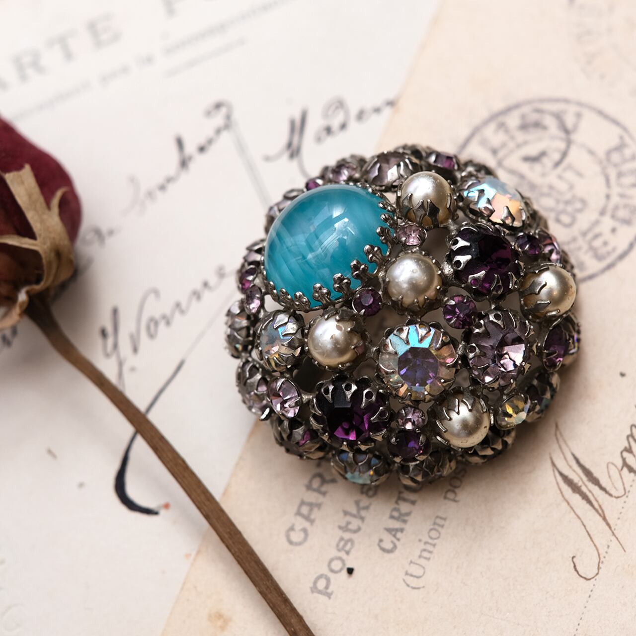 柔らかなグリーンのカボッション、様々な大きさのオーロラカラー、パールカラー紫などの石が、不規則に配置されており、落ち着いた色合いでありながらとても楽しい印象です。