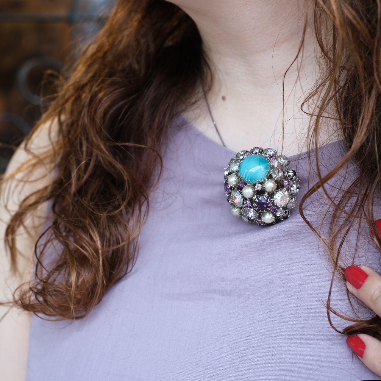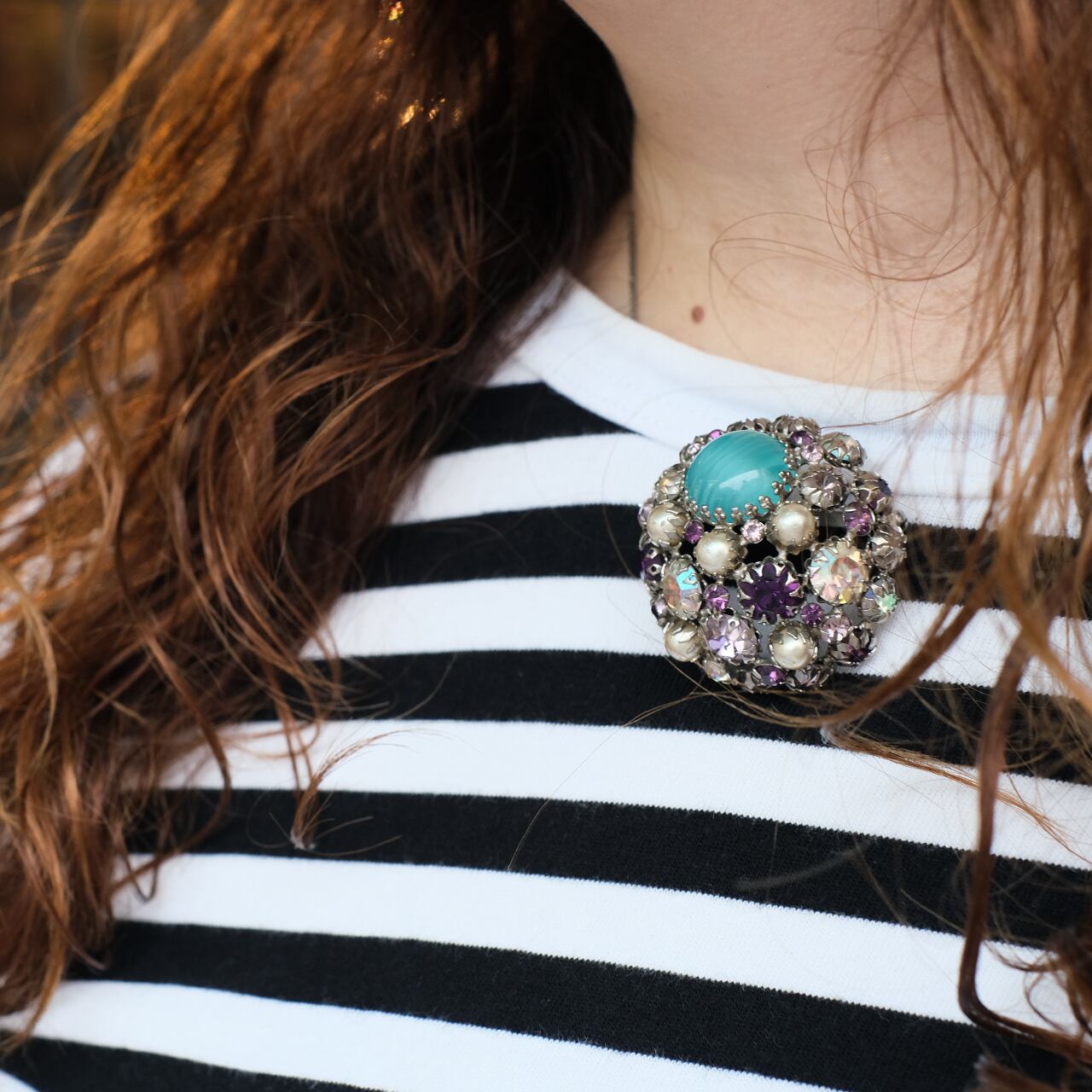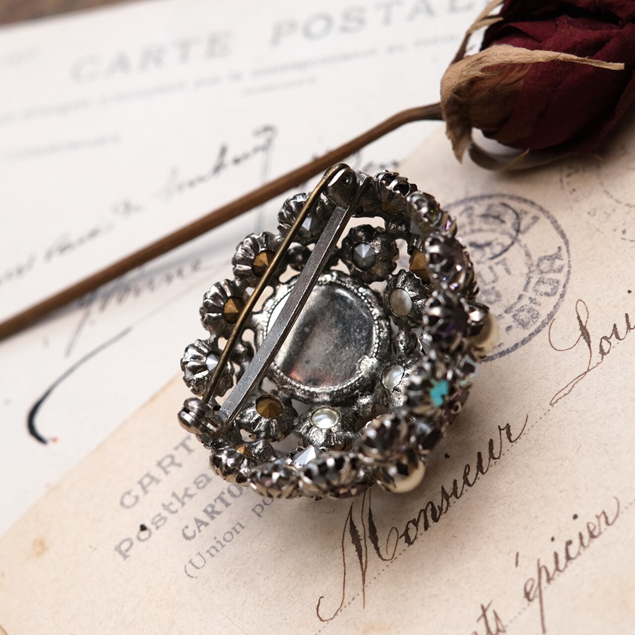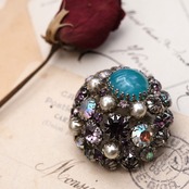 柔らかなグリーンのカボッション、様々な大きさのオーロラカラー、パールカラー紫などの石が、不規則に配置されており、落ち着いた色合いでありながらとても楽しい印象です。
