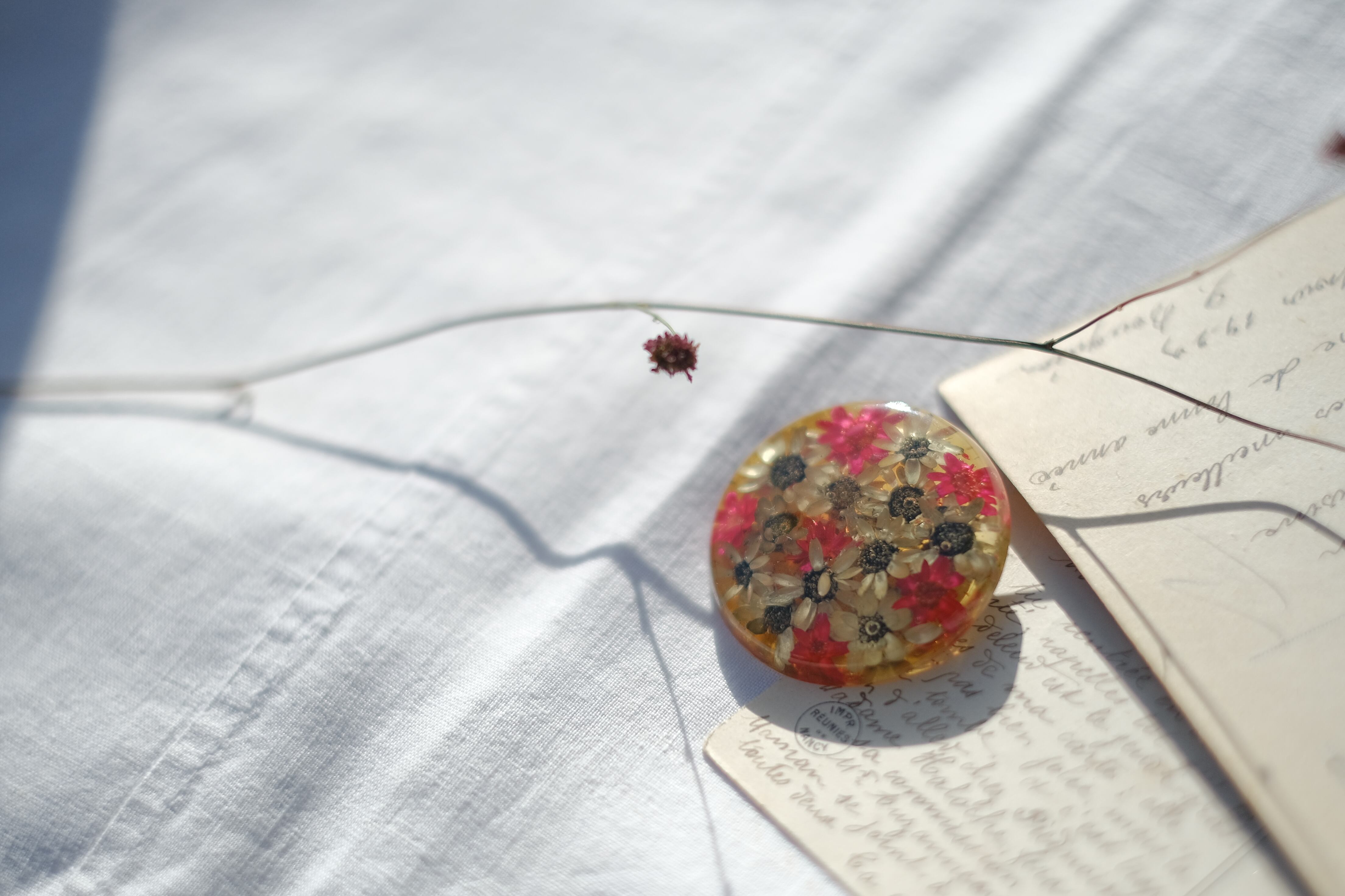立体的な紅白のお花がぎゅっとかわいく閉じ込められている宝箱の中身みたいなときめくデザイン。