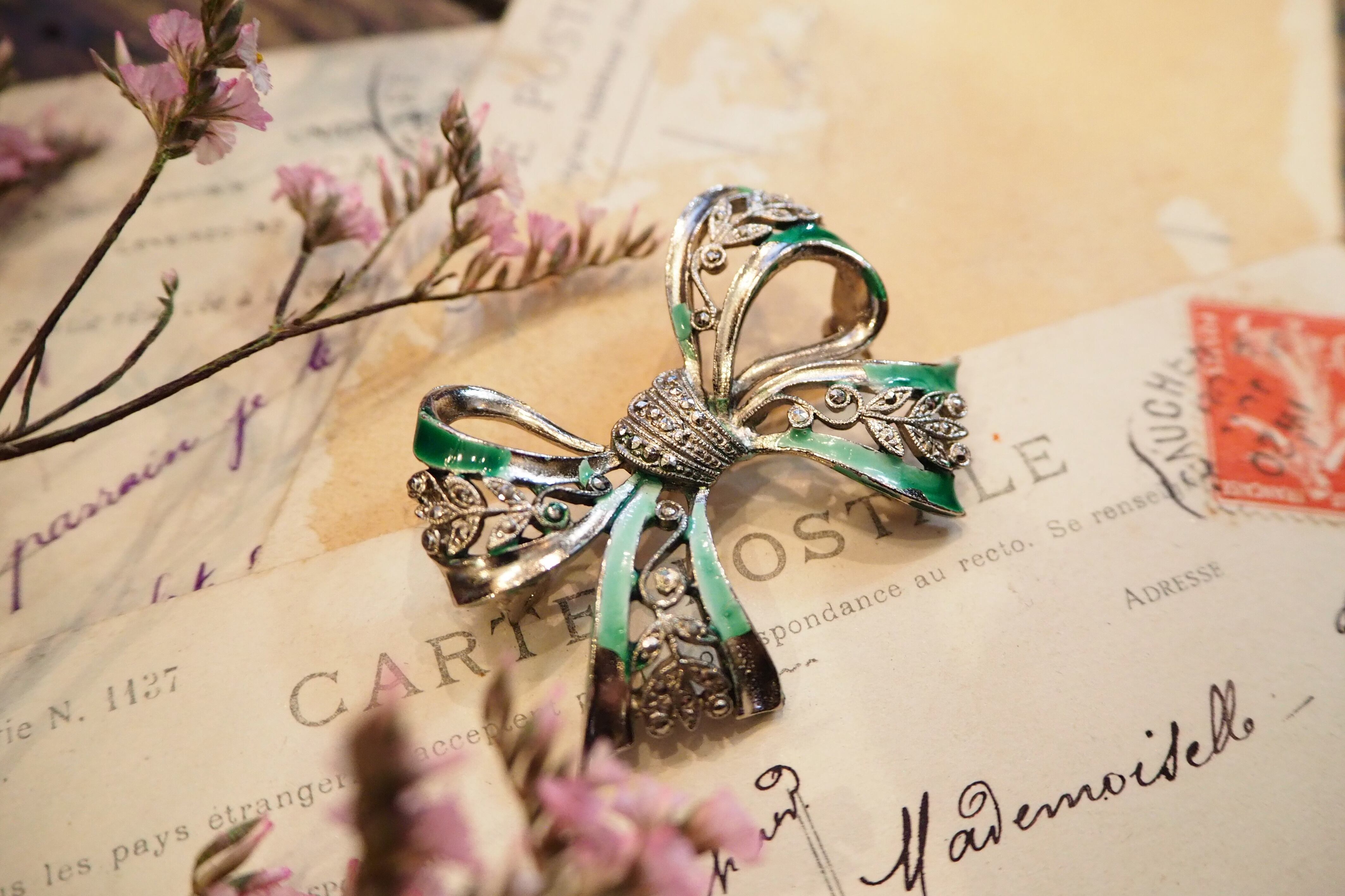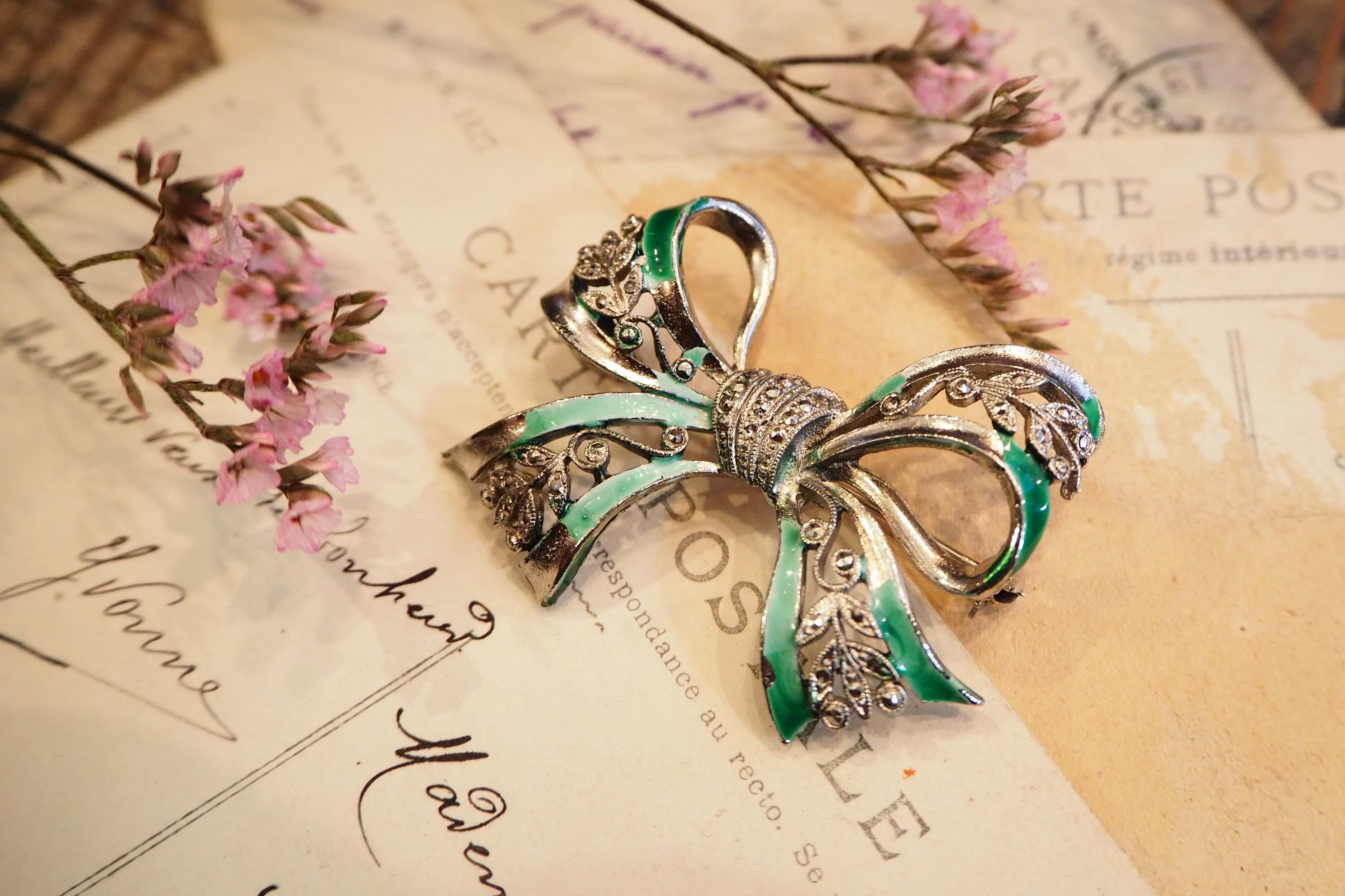 愛らしい植物の細工がリボンの中に入っていて、品がありながらも可愛らしいデザインです。