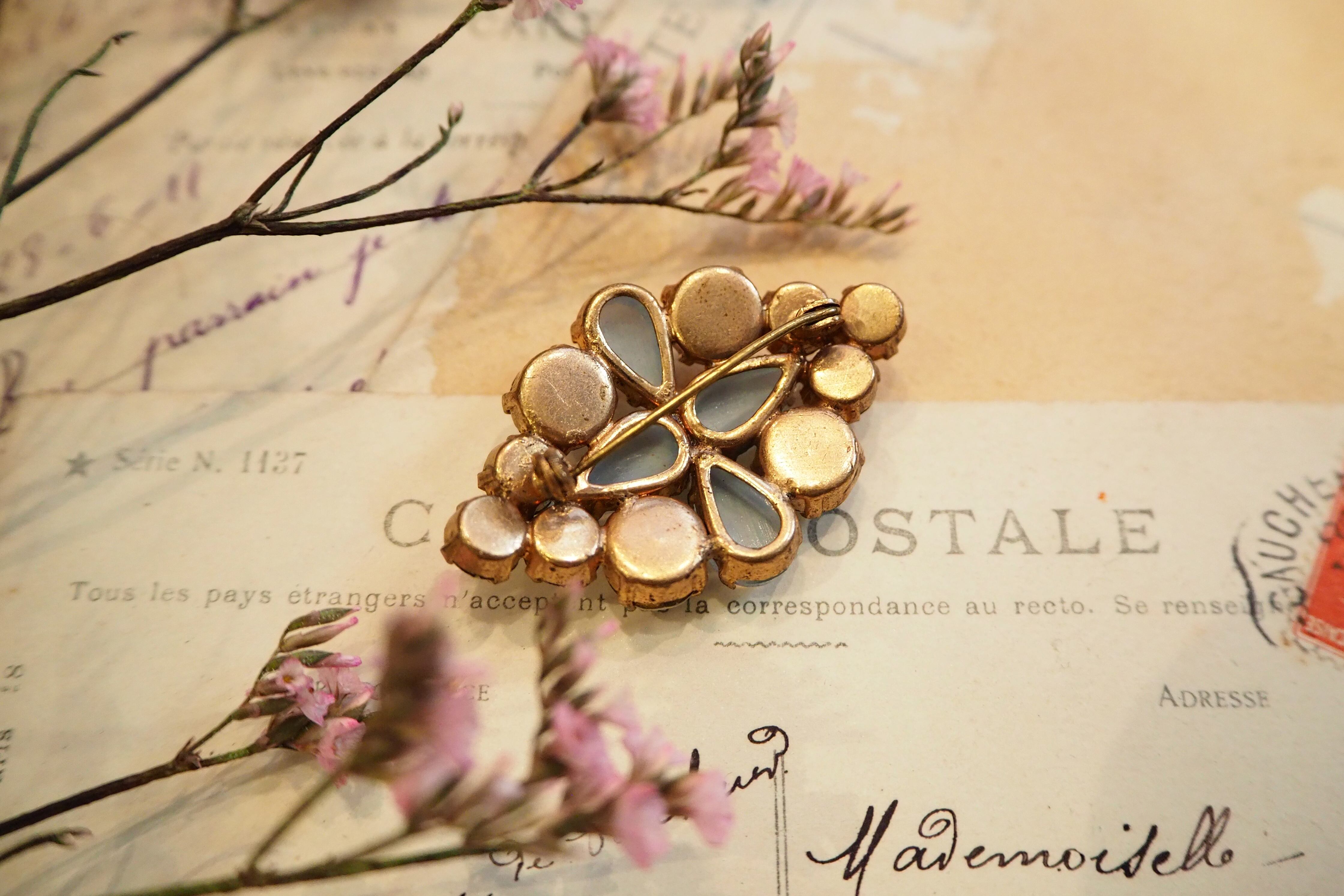 優しい色合いのブルーガラスとラインストーンのブローチです。