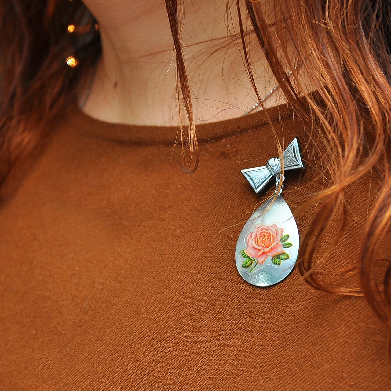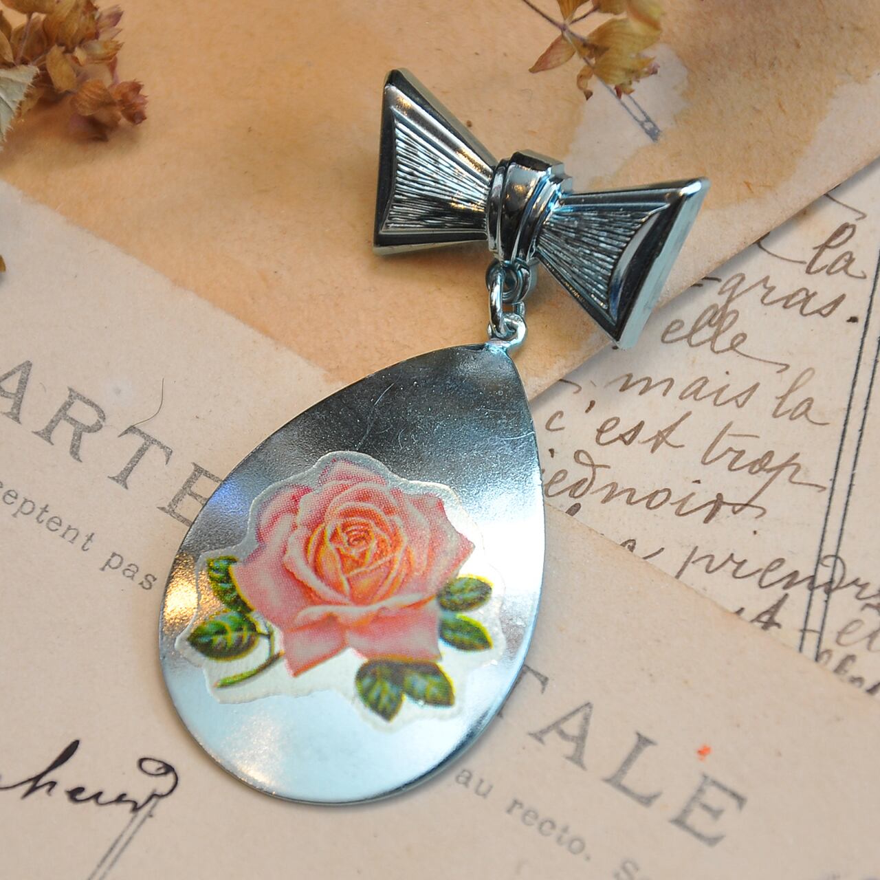 薔薇の絵が貼り付けられていてゆらゆら揺れる勲章のような形です。
