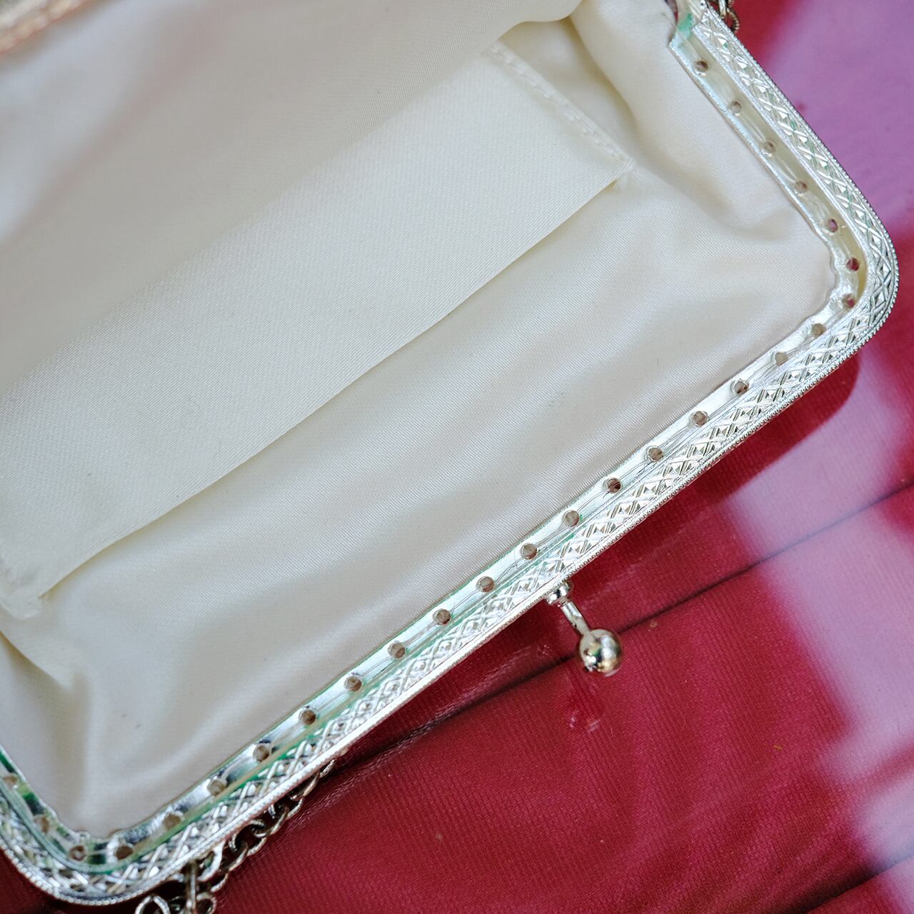 がま口も優しくしっかり留まり、内側のサテン布も美しく内ポケットもノーダメージです。