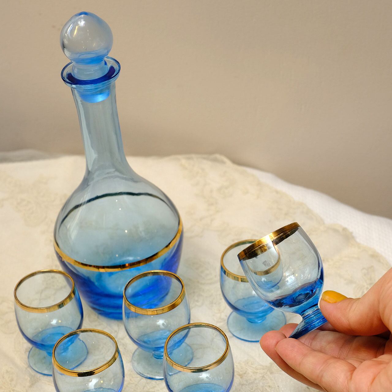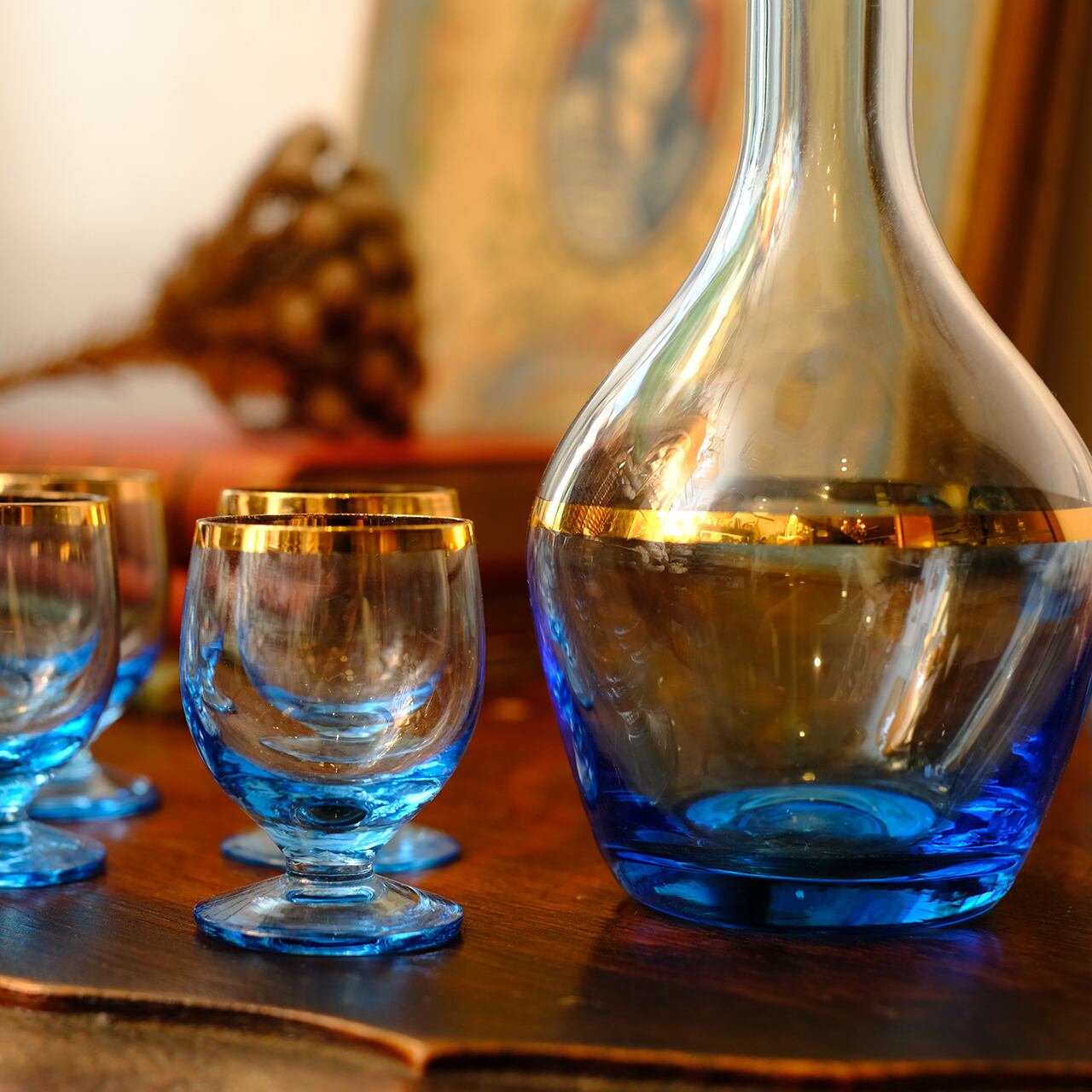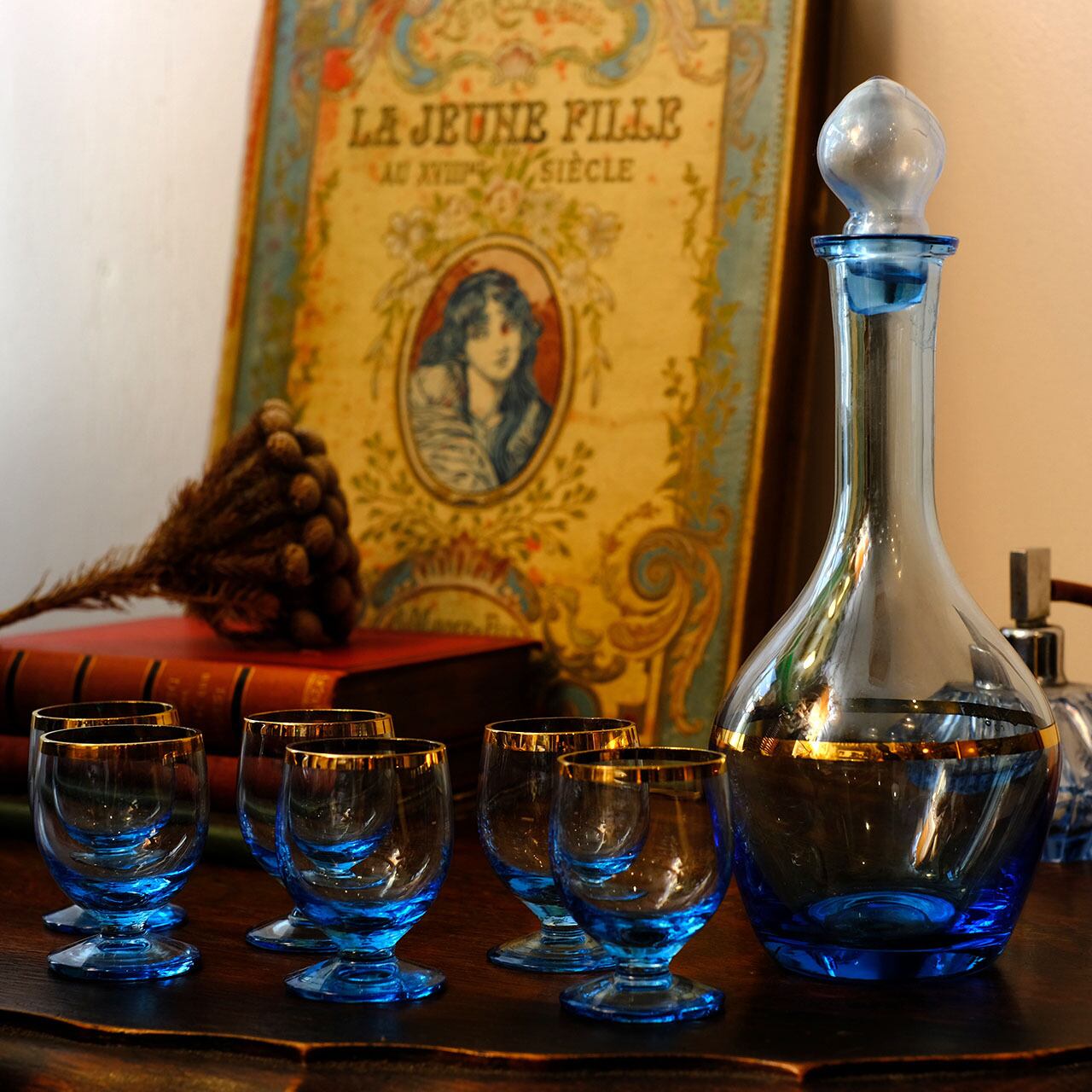 デッドストック ブルーチェコガラス デキャンタ+リキュールグラスセット【anfa00261】