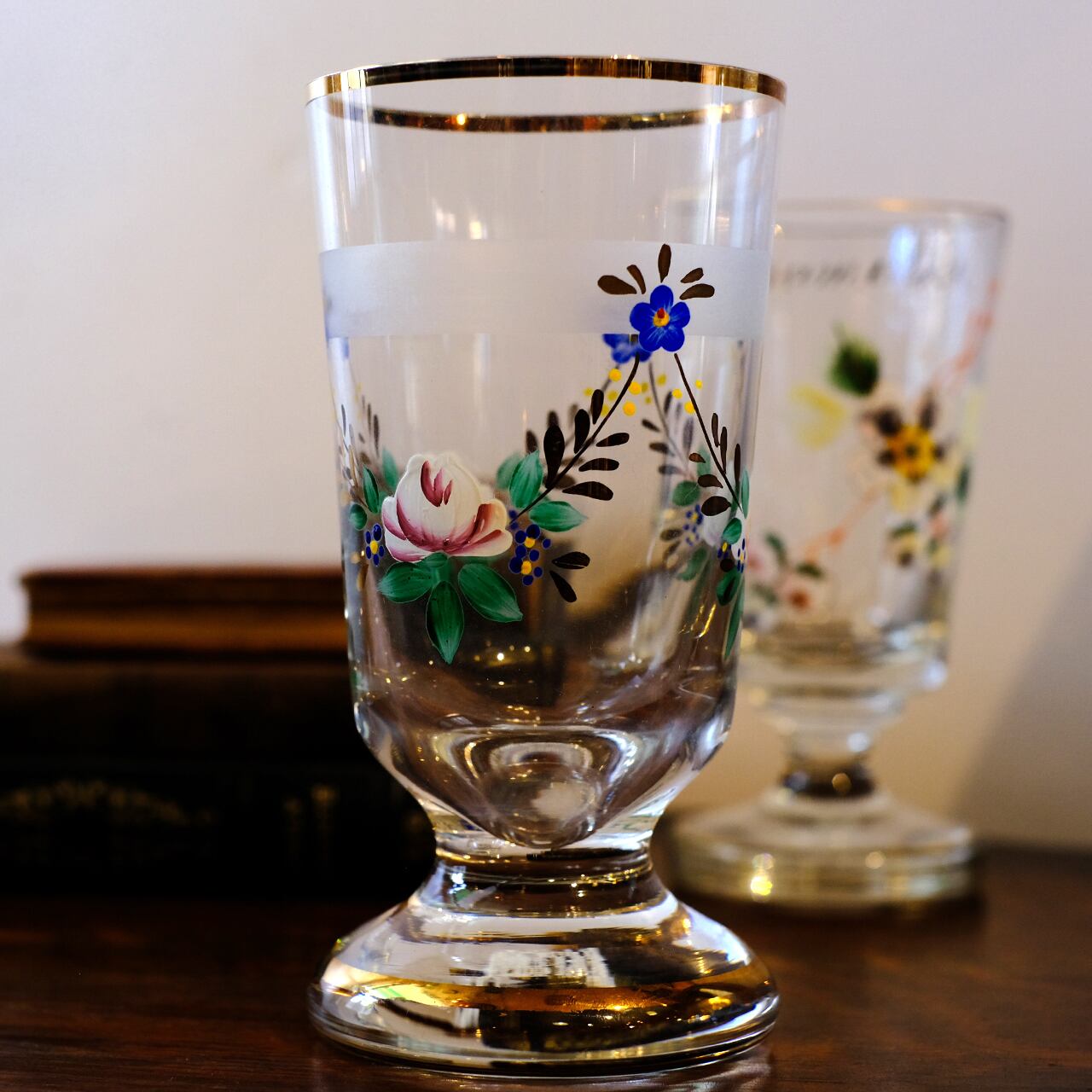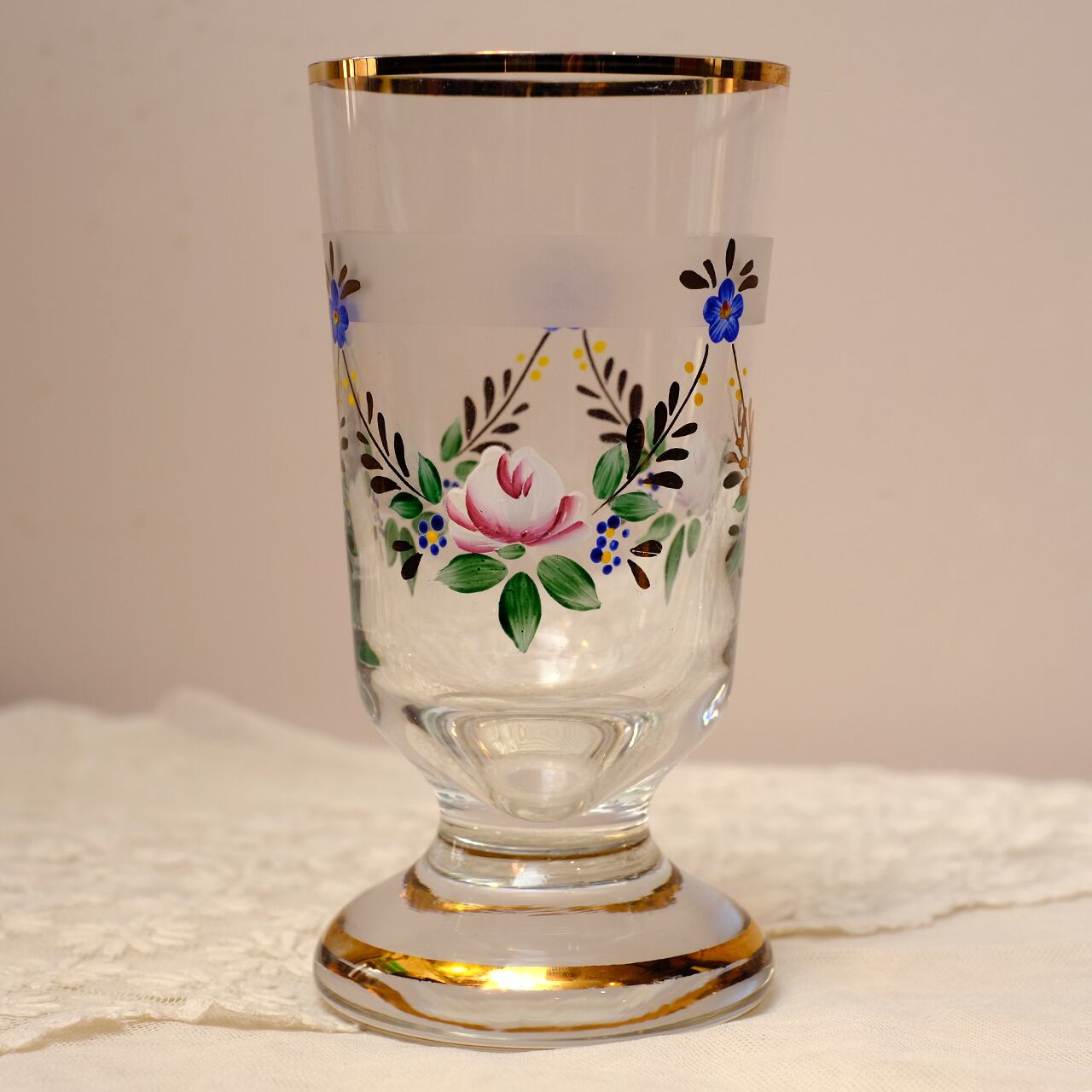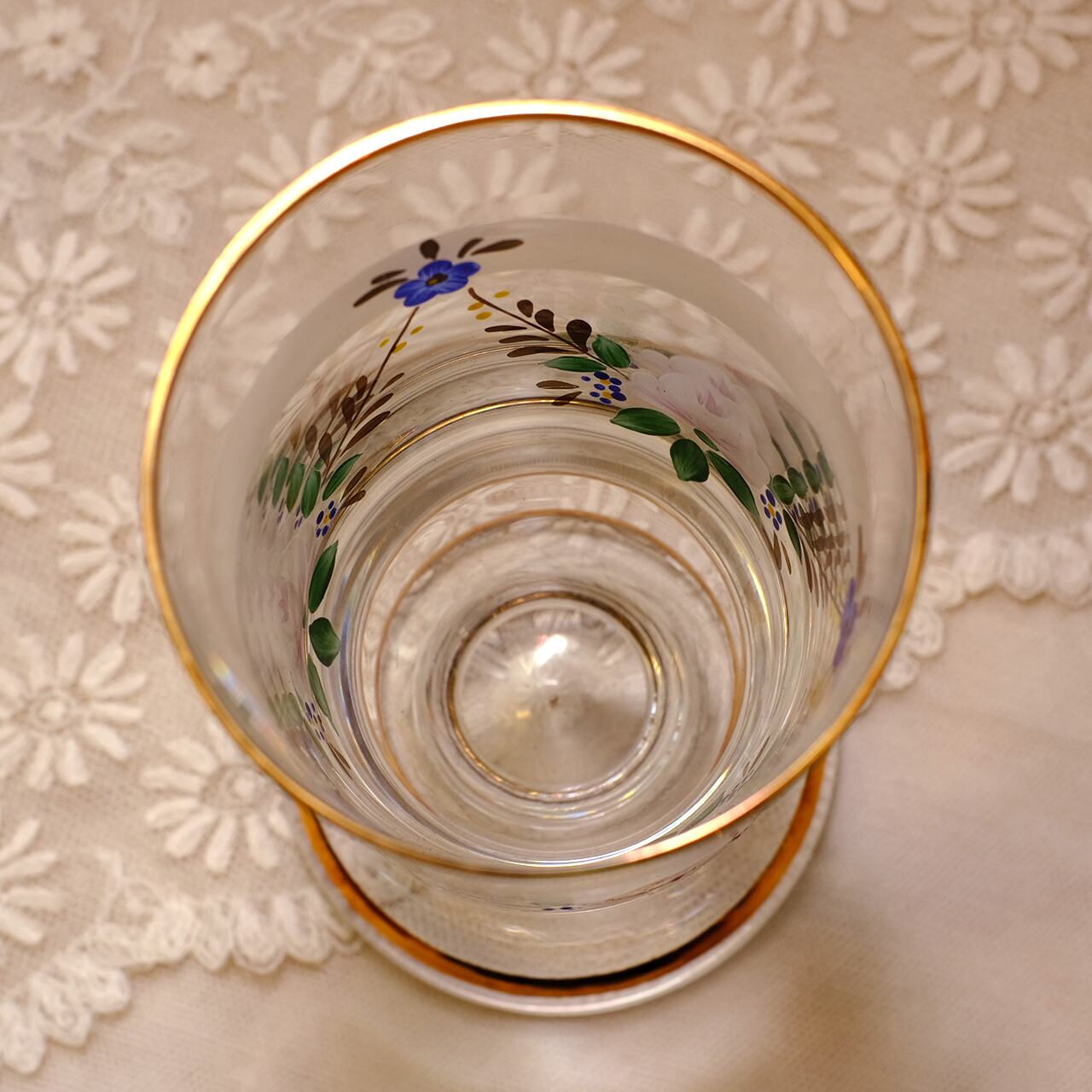 エナメル彩 薔薇と勿忘草のゴブレット(アンティークボヘミアンガラス)【anfa00272】