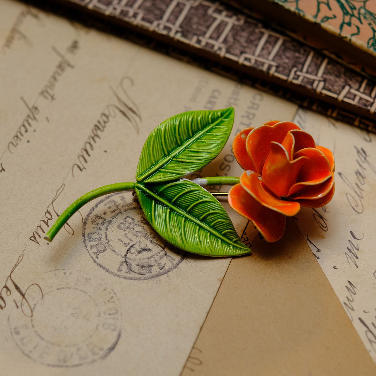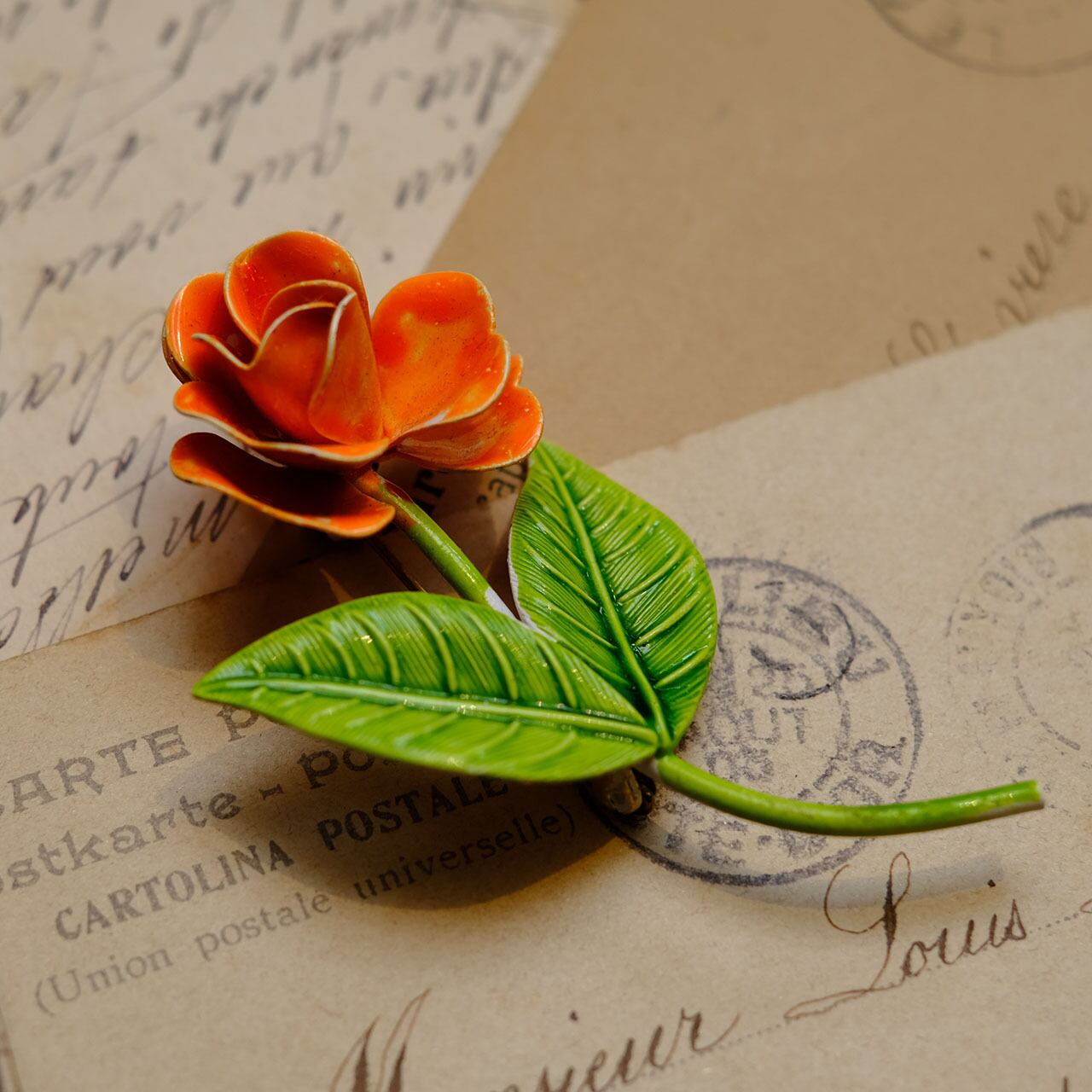 デッドストック オレンジの薔薇のメタルブローチ【anac01242】