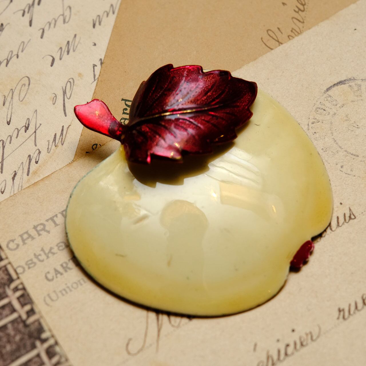 オフホワイトの林檎の実にメタリックな赤の葉っぱ、立体的な形も魅力的です。
